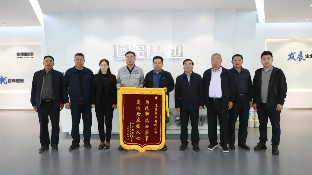 當天上午,張名怡書記帶領該鎮東方水、尹村、小金家村、黃城集村、下河頭村等村居負責人,專程來道恩集團感謝企業幫助果農銷售葡萄的善行義舉。他把寫有“為民解憂辦實事 愛心助農暖人心”的錦旗,贈送到集團副總裁王永放的手上。